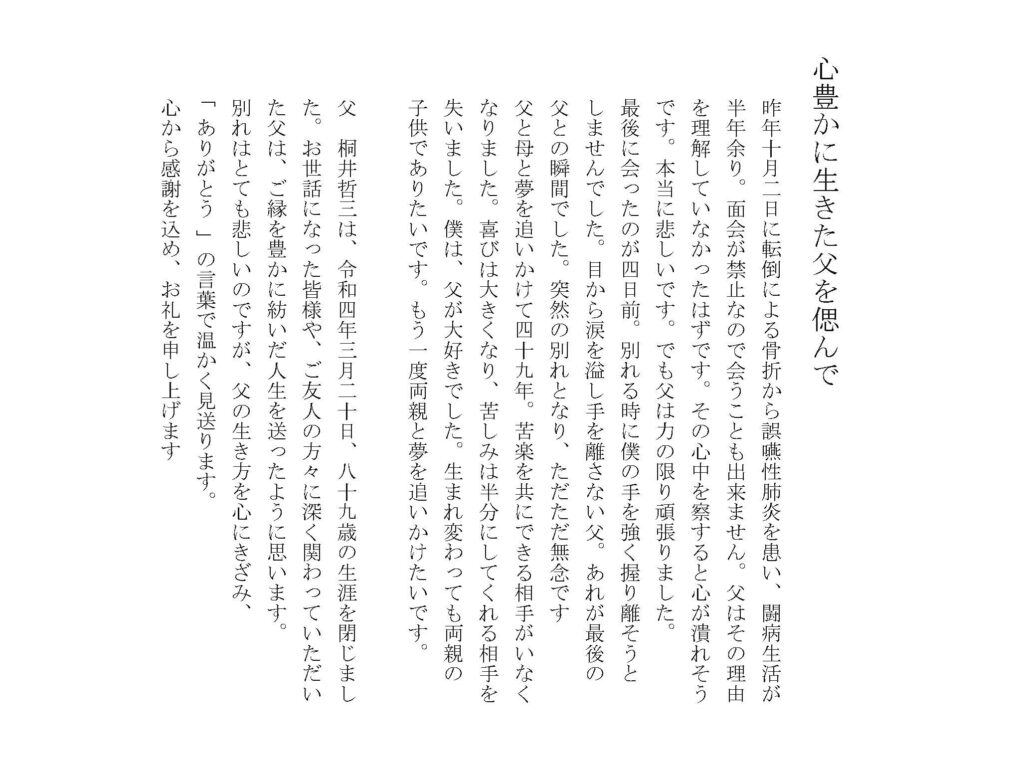父 桐井哲三は、令和四年三月二十日、八十九歳の生涯を閉じました。