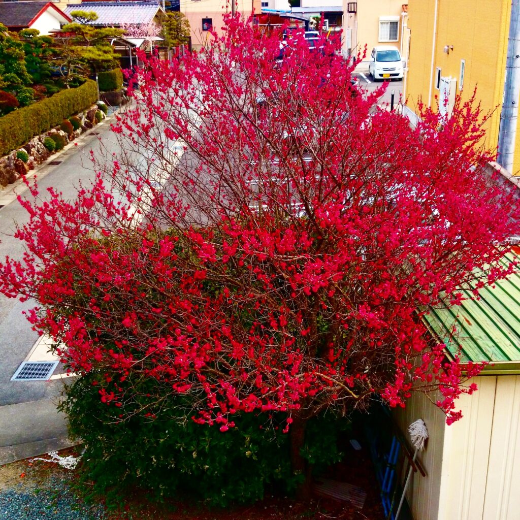 春の前に自宅で真っ赤に咲き誇る紅梅