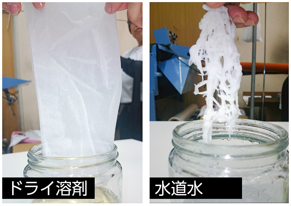 同じ容器に、ドライクリーニング専用の溶剤を入れたものと、水道水を入れたものを用意し、