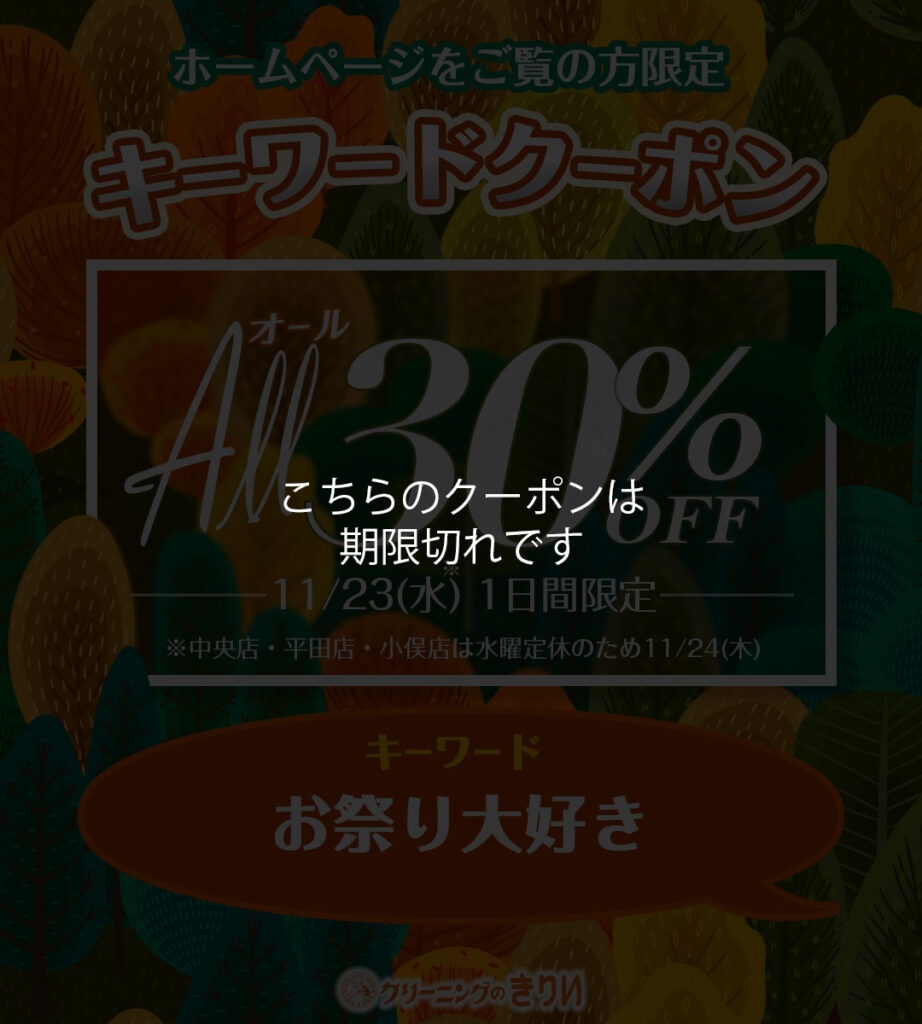 トップページきりいのブログ今月のホームページクーポン! 2022.11.25 今月のホームページクーポン! きりいのサービスいつもホームページをご覧いただいているお客様へ感謝の気持ちを込めてクーポンをプレゼントいたします!11月23日限定クーポンです。寒さも深まり、本格的な冬のご準備に。ぜひご利用ください♪–ご注意–*カウンターでキーワードをお伝えください。*中央店・平田店・小俣店は水曜日定休日のため翌日11/24(木)に使用可能です。*こちらのクーポンは外注品対象外です。*1日限定、1回のみご利用になります。 *その他サービス・クーポンとの併用はできません。