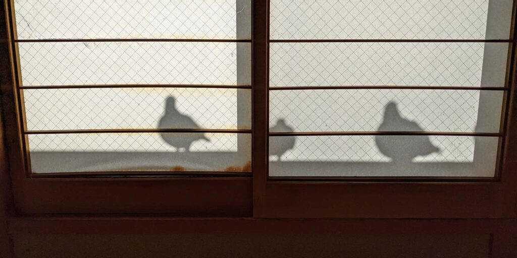 父の部屋のバルコニーに3羽の鳩が住みついています