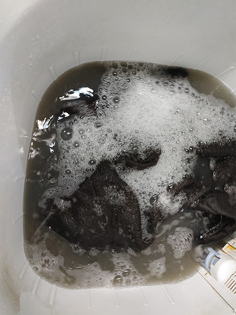 クリーニングのきりいで使用している水で、家庭用洗濯機の水洗いテストをした写真です。