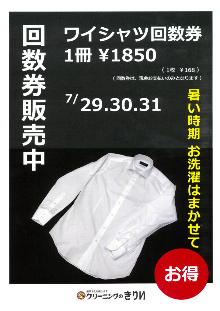 7/29・30・31 3日間☆ワイシャツ回数券販売
